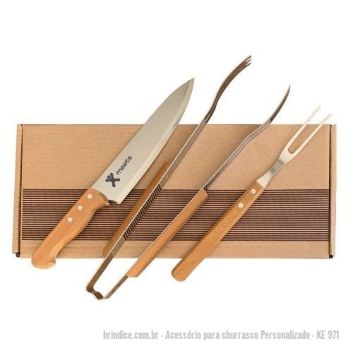 Acessório para churrasco Personalizado - KE 971 - Kit churrasco Tramontina com faca 8 , garfo trinchante e pegador. Gravação da logo a laser na lâmina da faca. Um presente tradicional, útil e de durabilidade extrema, garantindo a visualização da sua marca por muitos e muitos anos. Acompanha caixa para presente com listras em marrom. Despachamos com frete pago para todo o Brasil - 134737 - Portal de Brindes Personalizados | Guia Bríndice 38 Anos - Acessório para churrasco