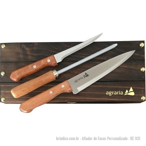 Afiador de Facas Personalizado - KE 931 - Kit churrasco em estojo de madeira envelhecida contendo chaira (afiador), faca churrasco Tramontina 7 e faca de desossa. Gravação indelével da logo a laser no estojo e na faca de churrasco. Um presente tradicional, útil e durável, garantindo a visibilidade da sua marca por muitos e muitos anos. Despachamos com frete pago para todo o Brasil - 145794 - Portal de Brindes Personalizados | Guia Bríndice 38 Anos - Afiador de Facas