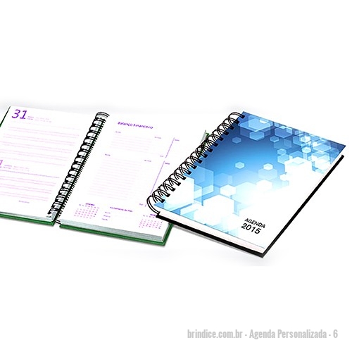 Agenda Personalizada - 6 - Fabricação própria, agendas personalizados do seu jeito. Permite lâminas de publicidade. Tamanhos 15x21 cm. Capa impressa em 4 cores, miolo de agenda diária impresso em duas cores contendo 4 idiomas, Dados pessoais, contatos telefônicos, mapa mundi colorido completo e calendário dos dois próximos anos. Acabamento em wire-o. - 83580 - Portal de Brindes Personalizados | Guia Bríndice 38 Anos - Agenda