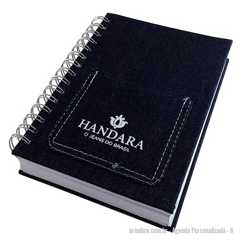 Agenda Personalizada - 6 - Fabricação própria, agendas personalizados do seu jeito. Permite lâminas de publicidade. Tamanhos 15x21 cm. Capa revestida em jeans com gravação em silk e porta cartão/canetas, miolo de agenda diária impresso em duas cores contendo 4 idiomas, Dados pessoais, contatos telefônicos, mapa mundi colorido completo e calendário dos dois próximos anos. Acabamento em wire-o. - 83585 - Portal de Brindes Personalizados | Guia Bríndice 38 Anos - Agenda