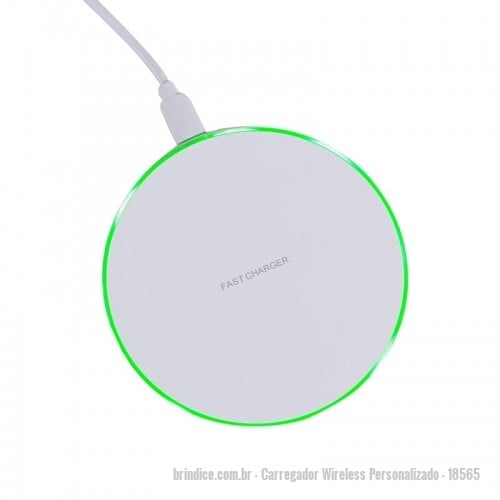 Carregador Wireless Personalizado - 18565 - Carregador wireless por indução em formato de disco. Produzido em material plástico, o carregador possui antiderrapantes de silicone na parte inferior. Para desfrutar do carregamento por indução (sem fio) é fundamental que o celular possua a tecnologia QI – desta maneira é possível carregar o celular posicionando-o sob carregador, sendo necessário apenas necessário conectar o carregador à uma fonte de energia (USB ou diretamente na tomada). O carregador wireless possui a tecnologia de carga rápida, mas para a utilização deste modo é necessário que o celular também possua esta tecnologia, caso contrário será realizada a carga normal. O carregador possui luzes de funcionamento, quando ligado irá exibir a luz verde e ao entrar em modo de carga irá exibir uma luz azul. Entrada universal 5.0V=2A; Entrada carga rápida 9.0V=2A; Saída universal 5.0V=1A; Saída carga rápida 9.0V=1.2A; Distância de transmissão 8mm e taxa de conversão ?73%. Acompanha cabo USB. - 124333 - Portal de Brindes Personalizados | Guia Bríndice 38 Anos - Carregador Wireless