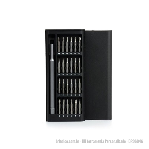 Kit ferramenta Personalizado - BR06046 - Kit ferramenta com 25 peças em estojo plástico com tampa de encaixe. Contém: 1 chave extensora rotatória para conexão das ponteiras, 1 ponteira Tri-Wing, 5 ponteiras Phillips, 4 ponteiras fenda, 10 ponteiras Torx, 2 ponteira Allen, 1 ponteira spanner e 1 ponteira fenda triangular. - 162900 - Portal de Brindes Personalizados | Guia Bríndice 38 Anos - Kit ferramenta