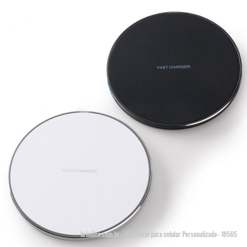 Acessório para celular Personalizado - 18565 - Carregador wireless por indução em formato de disco. Produzido em material plástico, o carregador possui antiderrapantes de silicone na parte inferior. Para desfrutar do carregamento por indução (sem fio) é fundamental que o celular possua a tecnologia QI – desta maneira é possível carregar o celular posicionando-o sob carregador, sendo necessário apenas necessário conectar o carregador à uma fonte de energia (USB ou diretamente na tomada). O carregador wireless possui a tecnologia de carga rápida, mas para a utilização deste modo é necessário que o celular também possua esta tecnologia, caso contrário será realizada a carga normal. O carregador possui luzes de funcionamento, quando ligado irá exibir a luz verde e ao entrar em modo de carga irá exibir uma luz azul. Entrada universal 5.0V=2A; Entrada carga rápida 9.0V=2A; Saída universal 5.0V=1A; Saída carga rápida 9.0V=1.2A; Distância de transmissão 8mm e taxa de conversão ?73%. Acompanha cabo USB. - 150112 - Portal de Brindes Personalizados | Guia Bríndice 38 Anos - Acessório para celular