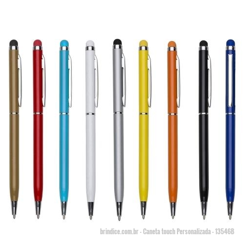 Caneta touch Personalizada - 13546B - Caneta metal fina com ponteira touch. Corpo colorido com clip e anel central prata, possui borracha touch na cor da caneta. Aciona por giro. Tamanho CxL : 13,6 cm x 1 cm. Peso g : 11 - 164559 - Portal de Brindes Personalizados | Guia Bríndice 38 Anos - Caneta touch