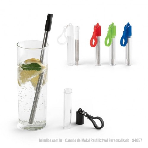 Canudo de Metal Reutilizável Personalizado - 94057 - Conjunto de canudo em aço inox e escova de limpeza. Fornecido em estojo com mosquetão. Food grade. Canudo: ø9 x 218 mm | Estojo: ø10 x 105 mm - 135373 - Portal de Brindes Personalizados | Guia Bríndice 38 Anos - Canudo de Metal Reutilizável