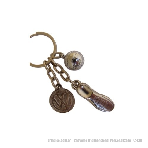 Chaveiro tridimensional Personalizado - CH3D - Chaveiro triplo em metal, gravação laser ou alto/baixo relevo, banho niquelado ou dourado, pintura à mão. Formato recortado conforme logomarca ou arte do cliente. - 152155 - Portal de Brindes Personalizados | Guia Bríndice 38 Anos - Chaveiro tridimensional