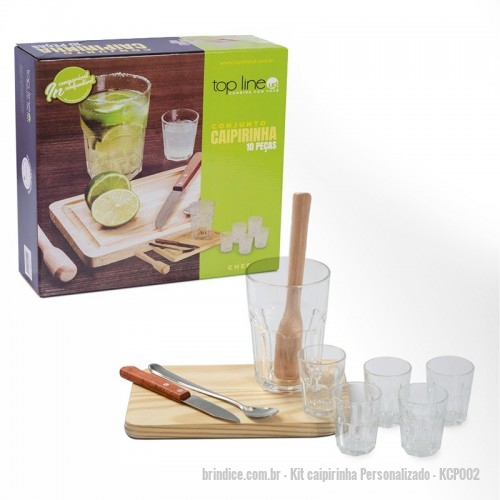 Kit caipirinha Personalizado - KCP002 - Kit caipirinha 10 peças. Produto ecologicamente correto, feito com madeira de reflorestamento. Conjunto Caipirinha 10 Peças é prático e bem completo. São peças fáceis de usar e de alta qualidade para tornar a caipirinha ainda mais saborosa. Contém: 1 copo de vidro – 400 ml; 5 copos de vidro – 60 ml; 1 socador de madeira – 19 cm; 1 prancha de madeira – 22 cm x 14 cm x 1,5 cm; 1 colher de inox – 18 cm; 1 faca inox 3? com cabo de madeira - 148700 - Portal de Brindes Personalizados | Guia Bríndice 38 Anos - Kit caipirinha
