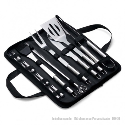 Kit churrasco Personalizado - 01906 - Kit Churrasco 17 Peças em estojo de nylon com alça. Contém: pegador, garfo, espátula, faca, pincel, 4 espetos e 8 garfos pequenos para petiscos. Utensílios de inox com proteções plásticas e parte interna com velcro para fixação das peças, acompanha plaquinha metálica para personalização. - 156145 - Portal de Brindes Personalizados | Guia Bríndice 38 Anos - Kit churrasco