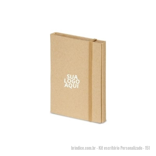 Kit escritório Personalizado - 151 - Kit para Escritório Personalizado. Kit para escritório em cartão, perfeito para brindes corporativos. Inclui um caderno com 80 folhas pautadas em papel reciclado, seis blocos adesivados com 25 folhas cada, uma régua de 12 cm, uma esferográfica em papel kraft com escrita na cor azul e um suporte para cartões de visita. Com dimensões de 110 x 153 mm, este kit é um brinde ideal para empresas que buscam oferecer itens práticos e sustentáveis - 167535 - Portal de Brindes Personalizados | Guia Bríndice 38 Anos - Kit escritório