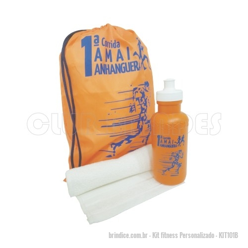 Kit fitness Personalizado - KIT101B - Kit composto por mochila saco em nylon, squeeze plástico 500 ml e toalha fitness. Disponível em várias cores. Gravação da logomarca em 1 cor já inclusa. Tamanho: Mochila Saco - Aprox. 41 cm X 32 cm. - 108933 - Portal de Brindes Personalizados | Guia Bríndice 38 Anos - Kit fitness