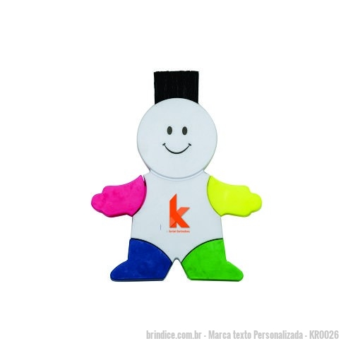 Marca texto Personalizada - KR0026 - Caneta marca texto com limpador de tela e teclado. Boneco plástico branco com olhos e boca em preto, marca texto nas cores: amarelo, azul, rosa e verde. Parte traseira com feltro para limpeza de tela e teclado, para acionar as cerdas(limpador de teclado) basta movimentar o botão para cima ou para baixo. - 130961 - Portal de Brindes Personalizados | Guia Bríndice 38 Anos - Marca texto