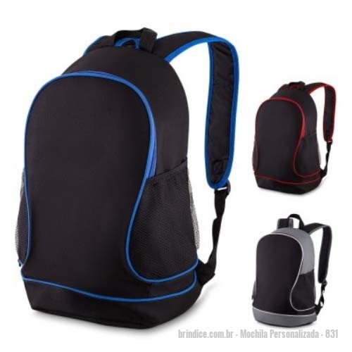 Mochila Personalizada - 831 - Somos fabricantes! Mochila produzida em nylon 600 disponível em diversas cores, possui bolsos telados nas laterais, costas e alças de ombro anatômicas. Medidas 43x28x18. Gravação do logotipo em serigrafia ou bordado. - 133509 - Portal de Brindes Personalizados | Guia Bríndice 38 Anos - Mochila