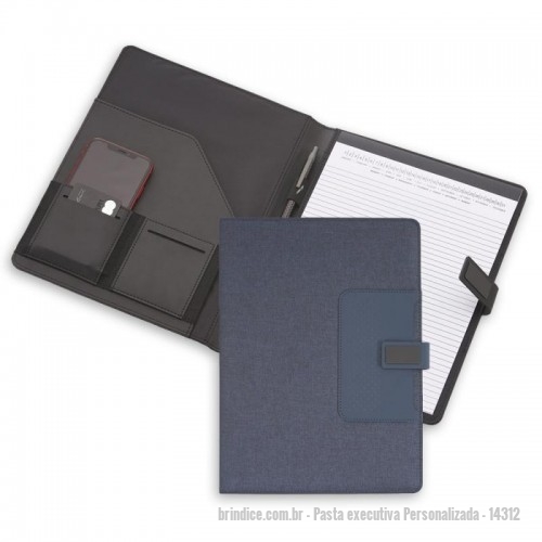 Pasta executiva Personalizada - 14312 - Pasta convenção com bloco para anotações. Pasta confeccionada em material sintético, possui fecho imantado com plaquinha emborrachada, “bolso” interno para arquivar documentos, suporte para cartões, celulares e caneta, além de um bloco com folhas brancas pautadas de aproximadamente 22 folhas. - 131360 - Portal de Brindes Personalizados | Guia Bríndice 38 Anos - Pasta executiva