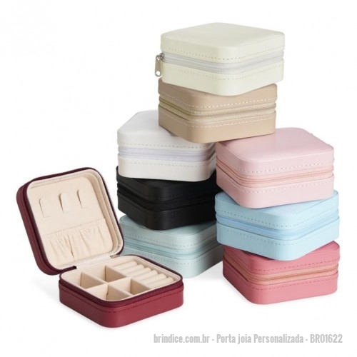 Porta joia Personalizada - BR01622 - Porta Joias Descrição: Porta joias de couro sintético com revestimento aveludado. Possui compartimentos internos para anéis, brincos, pulseiras e colares. Altura : 5,2 cm Largura : 10 cm Comprimento : 10 cm Peso aproximado (g): 103 - 152313 - Portal de Brindes Personalizados | Guia Bríndice 38 Anos - Porta joia