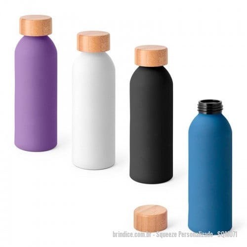 Squeeze Personalizado - SQM071 - Squeeze em alumínio com acabamento emborrachado e tampa em bambu. Capacidade até 550 ml - 147246 - Portal de Brindes Personalizados | Guia Bríndice 38 Anos - Squeeze