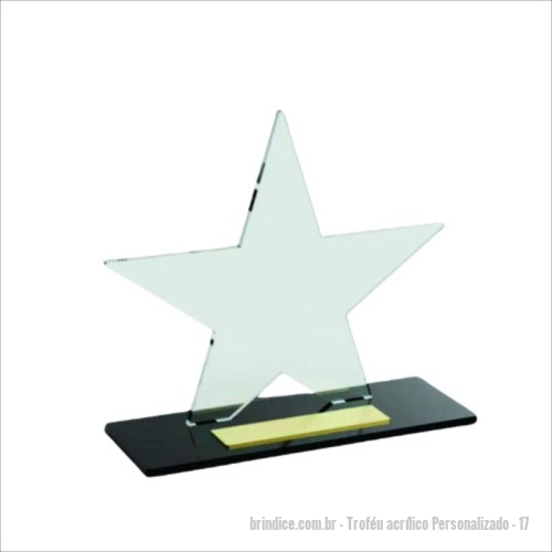 Troféu acrílico Personalizado - 17 - roféu em acrílico com personalização. Para homenagens e premiações. Formato de estrela com base retangular. Modelo versátil e moderno! Produzido em Acrílico 100% Virgem. Muito mais resistente e transparente, não amarela, livre de odores e contaminantes. PERSONALIZE COMO QUISER! Personalização com Impressão UV direto no acrílico. - 166932 - Portal de Brindes Personalizados | Guia Bríndice 38 Anos - Troféu acrílico