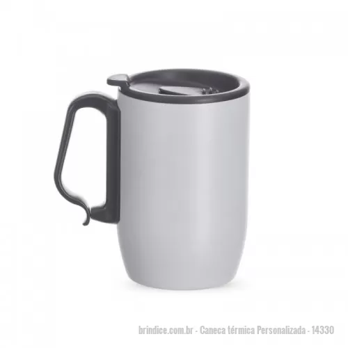 Caneca Inox 380ml Com Parede Dupla. Possui Tampa Plástica Com Trava Para Abertura Do Bocal, Alça Plástica Estilo Mosquetão E Base Com Apoio Eva. Obs.: Conserva Temperatura.. Veja mais: Caneca térmica personalizada... CANECA