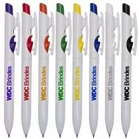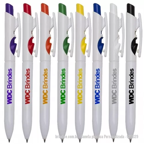 Caneta Plástica Corpo Branco Com Detalhes Coloridos No Botão E Trava. Aciona Por Clique E Trava No Acionador. Veja mais: Caneta plástica personalizada...