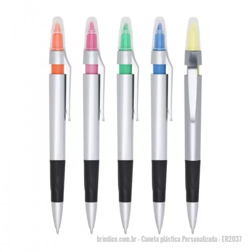 Caneta Plástica Esferográfica E Marca Texto Com Corpo Prata.. Veja mais: Caneta plástica personalizada...