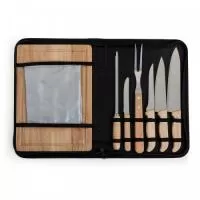 Kit Para Churrasco Cabo Em Bambu, Laminas Em Aço Inox Com Avental. Acompanha Tábua Em Bambu 32,6 Cm X 22 Cm, 3 Facas De Corte E Uma De Serra Cabo De Bambu/inox, Chaira, Garfo Em Bambu/inox, E Avental Com Bolso Na Cor Prata. Acomodados Em Uma Maleta Em Náilon Preta, Costura Com Zíper . Tábua Confeccionada, Para Dar Maior Durabilidade E Não Deformar Com O Passar Do Tempo. Rebites Em Aço Inox, Um Dos Mais Resistentes à Ferrugem E Corrosão.