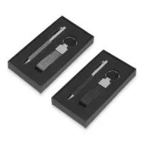 Kit Escritório De Metal Com Detalhes Em Pet Reciclado, Contendo: 1 Chaveiro Em Metal; 1 Caneta Metálica. Acompanha Caixa Com Berço Aveludado.. Veja mais: Kit escritório personalizado... Kit escritório