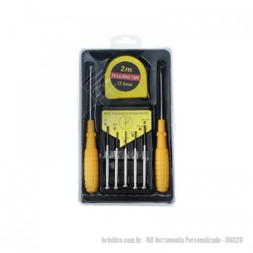 Kit Ferramenta 8 Peças Em Estojo Plástico Com Trava De Segurança. Contém Chave Phillips, Trena De 2 Metros Com Trava, Conjunto De 5 Chaves De Precisão E Chave De Fenda.. Veja mais: Kit ferramenta personalizado...