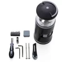 Kit Ferramenta 21 Peças Em Estojo Formato Garrafa De óleo. Material Plástico Resistente Com Detalhes Em Relevo(tampa Faz Apenas Parte Do Design), Possui Duas Travas Para Abertura E Acompanha: Estilete, Chave Canhão, 4 Extensores Bocais(7mm, 8mm, 9mm E 10mm), 2 Mini Chaves De Fenda E 2 Mini Chaves Phillips E Conjunto 10 Pontas(4 Chaves Phillips, 2 Chaves Fenda, 3 Chaves Torx E Um Adaptador).
