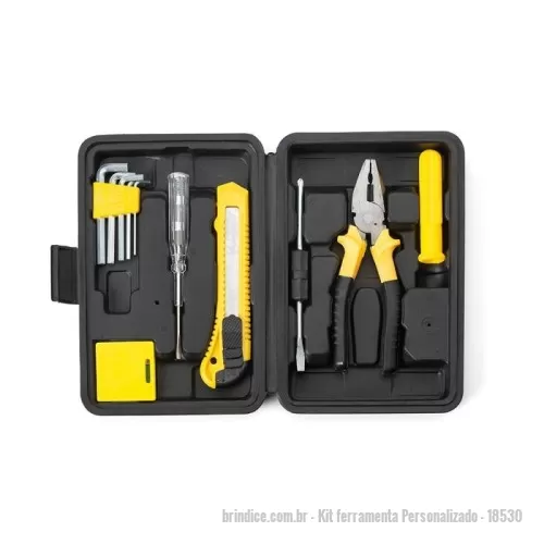 Kit Ferramenta 11 Peças Em Estojo Plástico. Maleta Plástica Com Detalhe Retangular No Centro Frontal E Verso Com O Detalhe Na Lateral Inferior, Possui Texturização No Estojo E Uma Trava Superior. Acompanha: Conjunto De 5 Chaves Allen, Trena De 1 Metro, Chave Teste, Estilete, Chave Dupla(phillips E Fenda), Alicate E Cabo Plástico Para Encaixe Da Chave Dupla.. Veja mais: Kit ferramenta personalizado... Kit ferramenta, estojo de ferramentas, maleta, 11 peças
