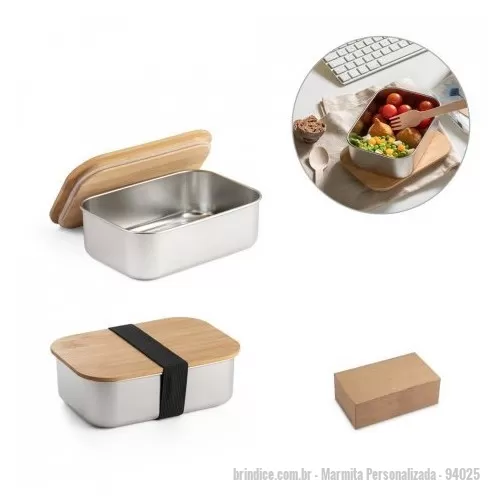Marmita Em Aço Inox E Tampa Em Bambu Com Banda Elástica Para Um Transporte Mais Seguro. Capacidade Até 800 Ml. Fornecida Em Caixa Presente De Papel Kraft Reciclado. Certificação Eu Food Grade. A Cor E O Resultado Da Impressão Nos Materiais Naturais Pode Variar Entre Produtos.. Veja mais: Marmita personalizada... Marmita, refeição, lancheira, alimento, bambu, aço inox, ecológico