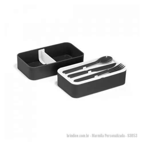 Marmita Em Pp E Ps Com 2 Compartimentos (680 Ml Cada) E 1 Divisória Removível. Incluso 3 Talheres: Garfo, Faca E Colher. Fecha Com Banda Elástica E Está Apta Para Micro-ondas, Retirando A Tampa. Caixa Branca 93852 Vendida Opcionalmente. Certificação Eu Food Grade.. Veja mais: Marmita personalizada...
