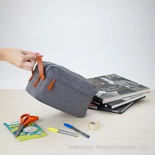 Nécessaire Confeccionada Em Poliéster, Com Detalhes Em Couro Sintético. Possui Três Compartimentos Com Zíper. Na Parte Interna, Contém 5 Bolsos, Sendo Dois De Tela, E Alça Para Transporte. Altura : 14,5 Cm Largura : 9,5 Cm Comprimento : 25 Cm. Veja mais: Nécessaire personalizado...