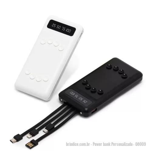 Carregador Power Bank De 10.000mah Com Lanternas E Múltiplas Saídas. Fabricado Em Plástico Com Display Integrado, Este Power Bank Vem Equipado Com Quatro Cabos De Carregamento, Eliminando A Necessidade De Transportar Cabos Extras. Compatível Com Entradas V8, Tipo-c, Lightning E Usb, Ele Oferece Praticidade Absoluta. Para Um Transporte Conveniente E Seguro, O Power Bank Possui Ventosas Para Fixação Do Celular E Uma Capacidade Real De 6.000mah Para Manter Os Dispositivos Sempre Carregados.. Acompanha Cabo Usb-v8.. Veja mais: Power bank personalizado... Power bank personalizado