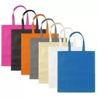 Sacola colorida com alça em material TNT, possui símbolo ecológico/reciclável na costura da alça.