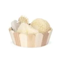 Kit banho com estilo natural envolvido em um cesto de madeira. Contém 4 itens: escova de madeira com cerdas macias, pedra-pomes, esponja redonda e uma esponja de nylon.