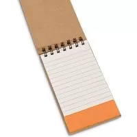 Bloco de anotações ecológico com caneta e post-it. Bloco com fechamento lateral tipo “envelope e com espiral preto lateral. Possui cinco blocos auto-colantes com 10 folhas cada, bloco com aproximadamente 70 folhas brancas pautadas e caneta de papelão de clip e ponteira plástica.