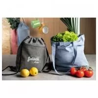 Sacola em 70% algodão reciclado e 30% poliéster reciclado (180 g/m²) com base em juta. Alças em webbing com 65 cm. 380 x 400 x 80 mm